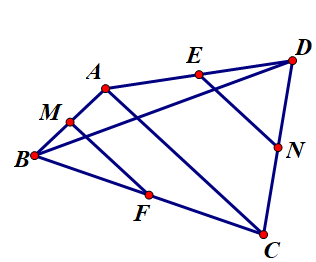 \(\begin{array}{l} \overrightarrow {AC} + \overrightarrow {BD} = 2\overrightarrow {MF} + 2\overrightarrow {ME} \\ = 2\left( {\overrightarrow {MF} + \overrightarrow {ME} } \right)\\ = 2\overrightarrow {MN} \end{array}\)