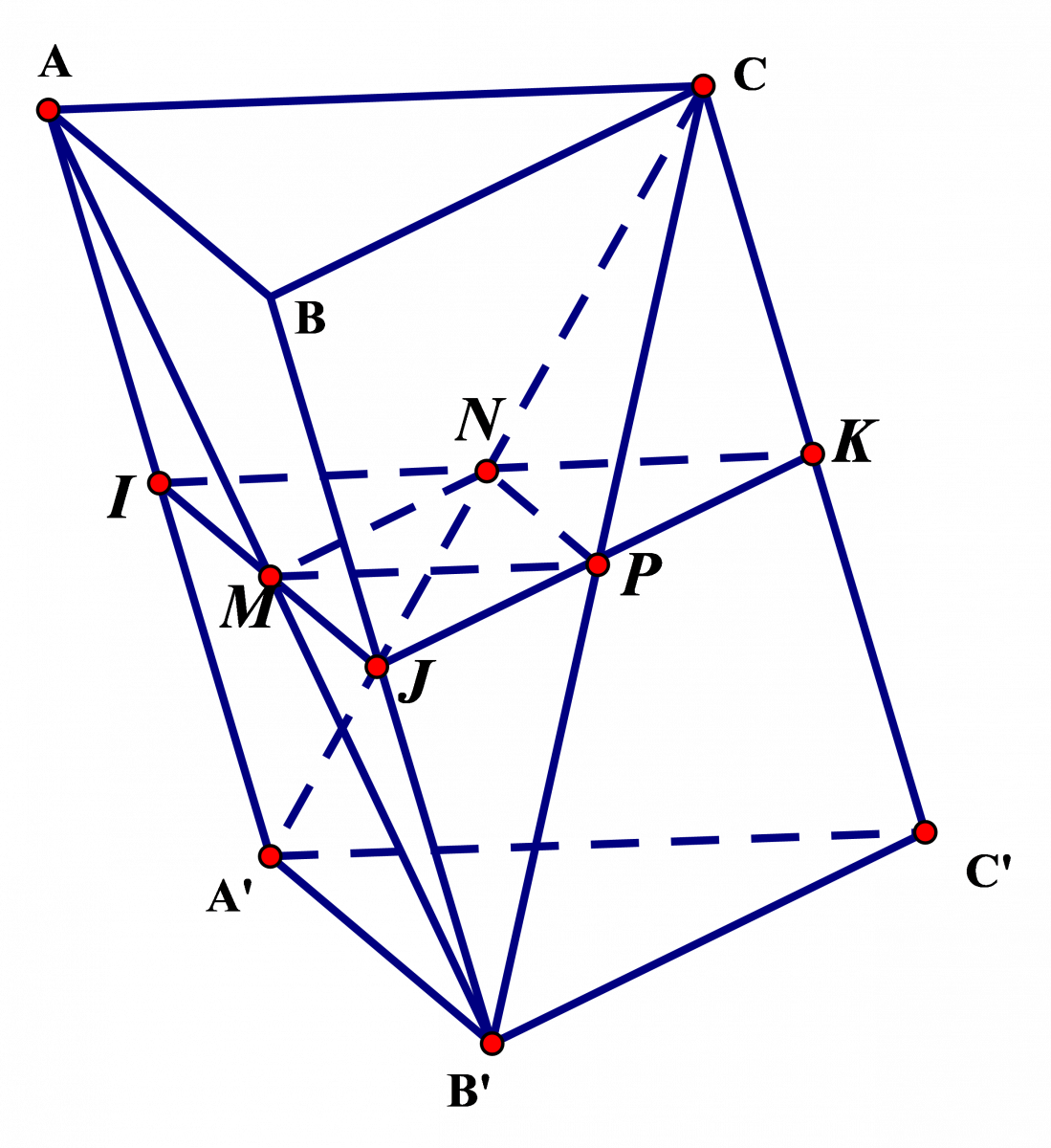 Thể tích cần tìm là \({{V}_{1}}={{V}_{ABC.MNP}}={{V}_{A'B'C'.MNP}}\)