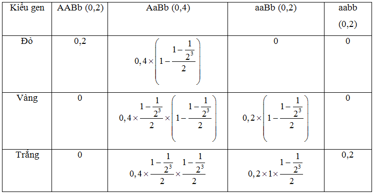 Cho A-B- : đỏ; A-bb : đỏ; aaB- : vàng và aabb: trắng. Một quần thể có cấu trúc di truyền như sau: 0,2 AABb: 0,4 AaBb: 0,2 aaBb: 0,2 aabb. Quần thể trên tự thụ phấn qua 3 thế hệ, tỷ lệ kiểu hình ở đời con F3 là: