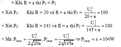 \(\begin{array}{l} {P_{m{\rm{ax}}}} = \frac{{{U^2}}}{{{R_1} + {R_2}}} = 120\\ \Leftrightarrow {U^2} = 120\left( {{R_1} + {R_2}} \right)\,(a) \end{array}\)