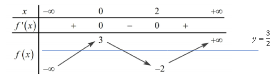 Nhìn vào bảng biến thiên ta thấy đồ thị hàm số \(y=f(x)\,\, \mathrm{và} \,\,y=\frac{3}{2}\) cắt nhau tại 3 điểm phân biệt nên số nghiệm của phương trinh là 3